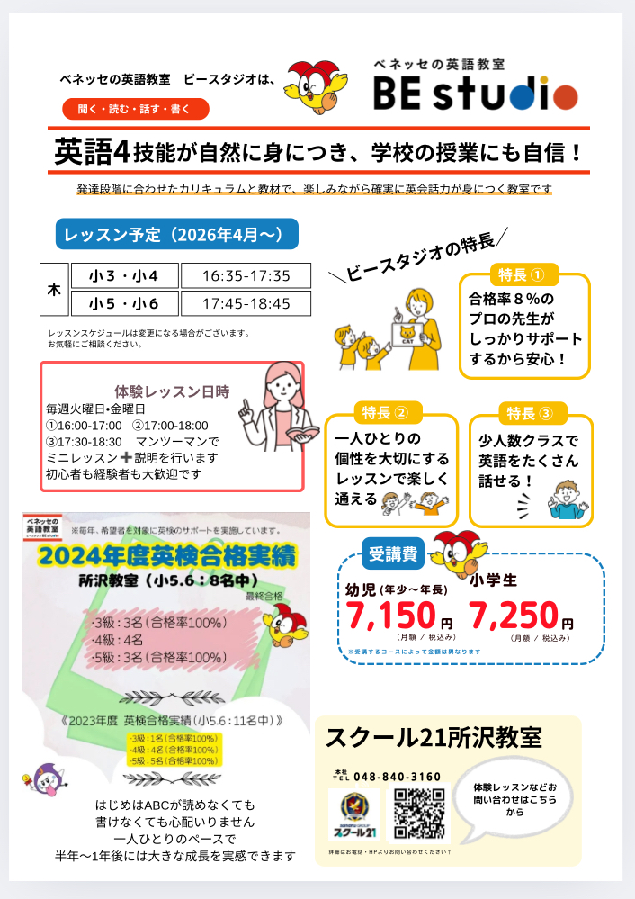 埼玉県の学習塾スクール21は、㈱ベネッセビースタジオと提携してベネッセの英語教室BE studioを運営しています。